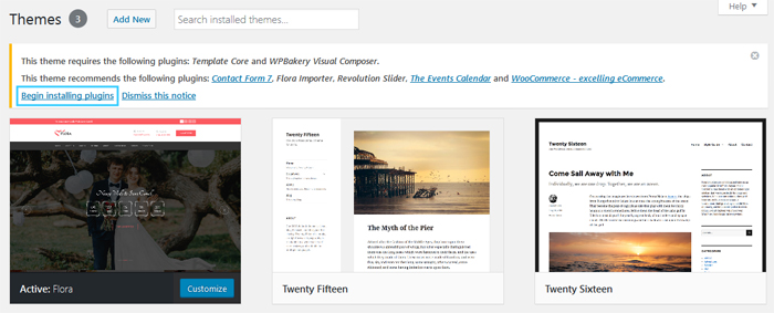 - In the notification message, click the Begin installing plugins to install the Plugins given in this theme.