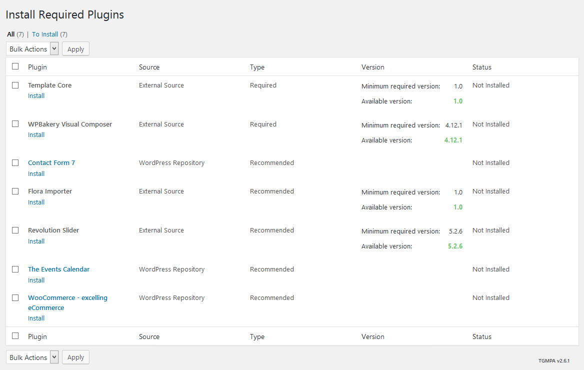 - Install and activate these plugins before you proceed: Visual Composer, Template Core, Flora Importer, Contact Form 7, The Events Calendar