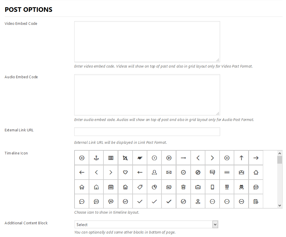 - Post Options – These options allow you to add video embed code, audio embed code and extenal URL for post formats. Also you can optionally show blocks in bottom of page by choosing in "Additional Content Block". Blocks need to add in "Blocks" post type.