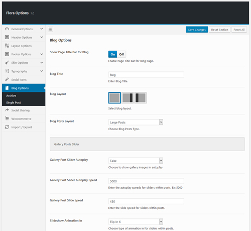 - Blog Options – These options allow you to customize archive layout, blog layout, single posts layout, gallery post slider settings, enable/disable post meta, excerpt length, pagination/infinite scroll and date format.