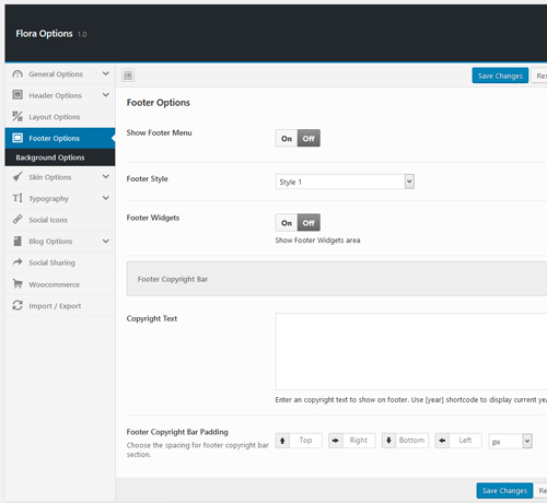 - Footer Options – Here you can choose footer style, footer widget areas, enable/disbale footer menu and customize copyright text.