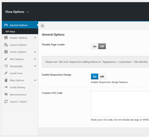 - General Options – In General options, you can enable or disable Page Loader, Responsive Design and also Custom CSS Code to add your custom styles for site without touching theme styles.