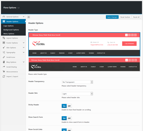 - Header Options – In Header options allows you to choose header type, skin and transparency.