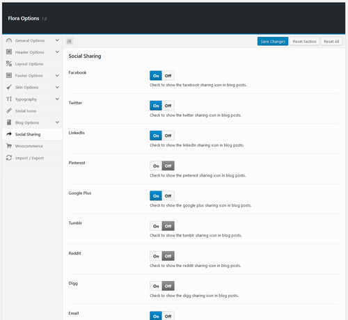 - Social Sharing – These options allow you to choose types of social sharing networks to blog posts for your site.
