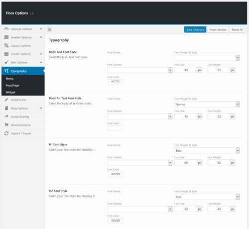 - Typography – Typography options allow you to select and customize google fonts for your body, headings, menus, page header, posts and widgets.