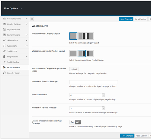 - Woocommerce – These options allow you to customize woocommerce category layout, single product layout, products columns, number of related products and enable/disable shop page ordering.